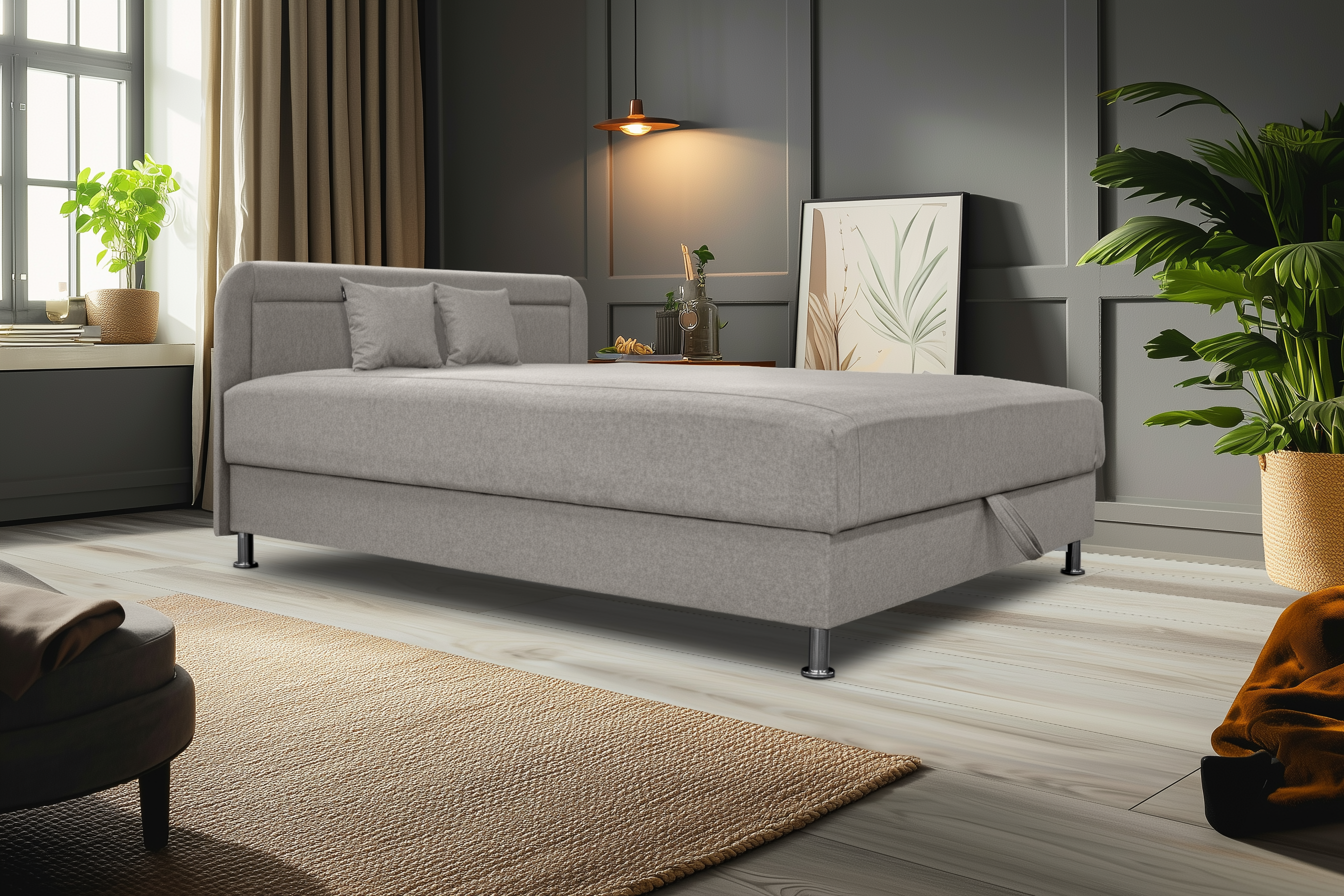 A 140x200cm, 160×200 cm-es fekvőfelület ideális pároknak, míg a beépített ágyneműtartó bőséges helyet kínál a takarók, párnák vagy szezonális textíliák tárolására.