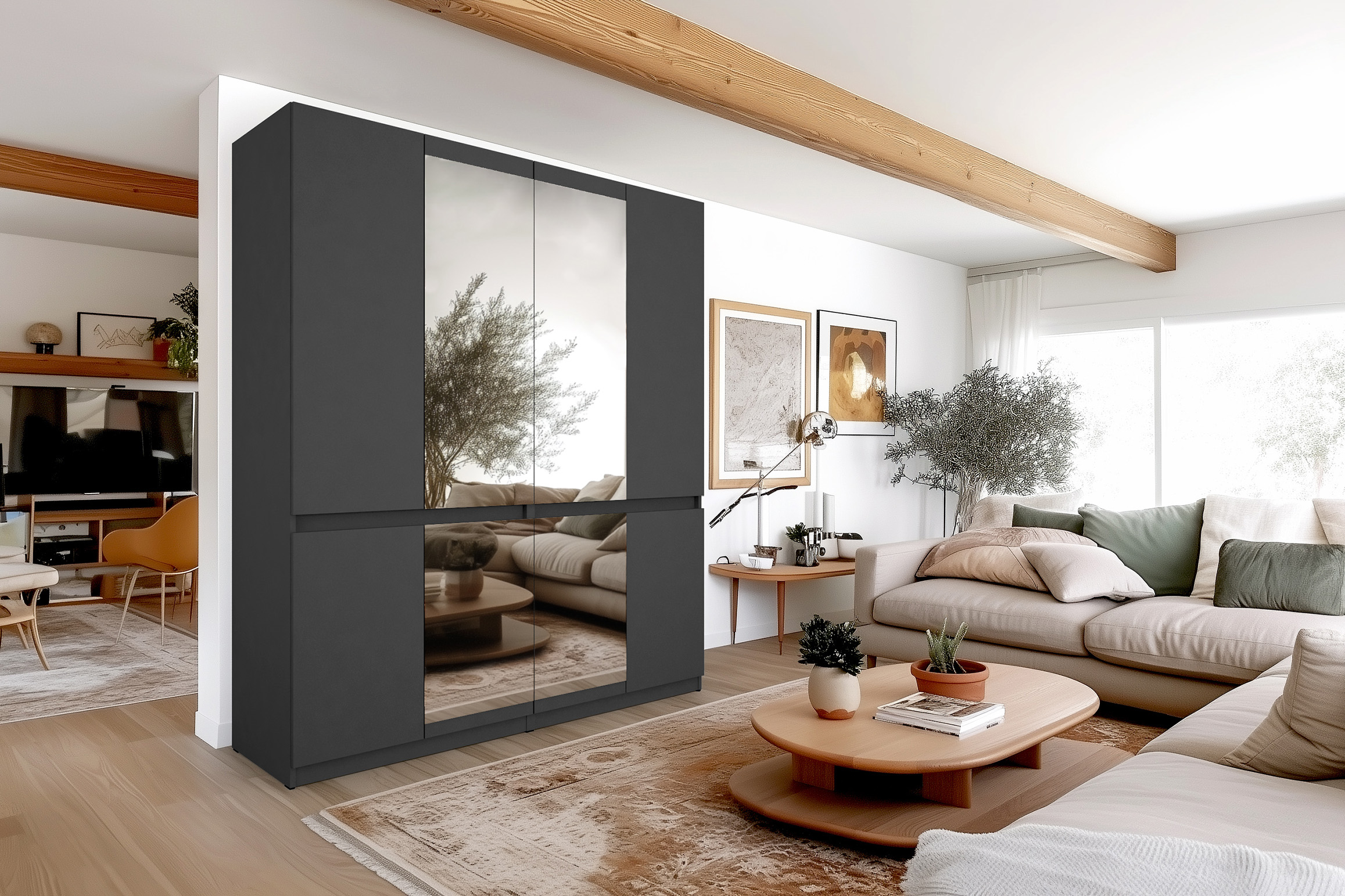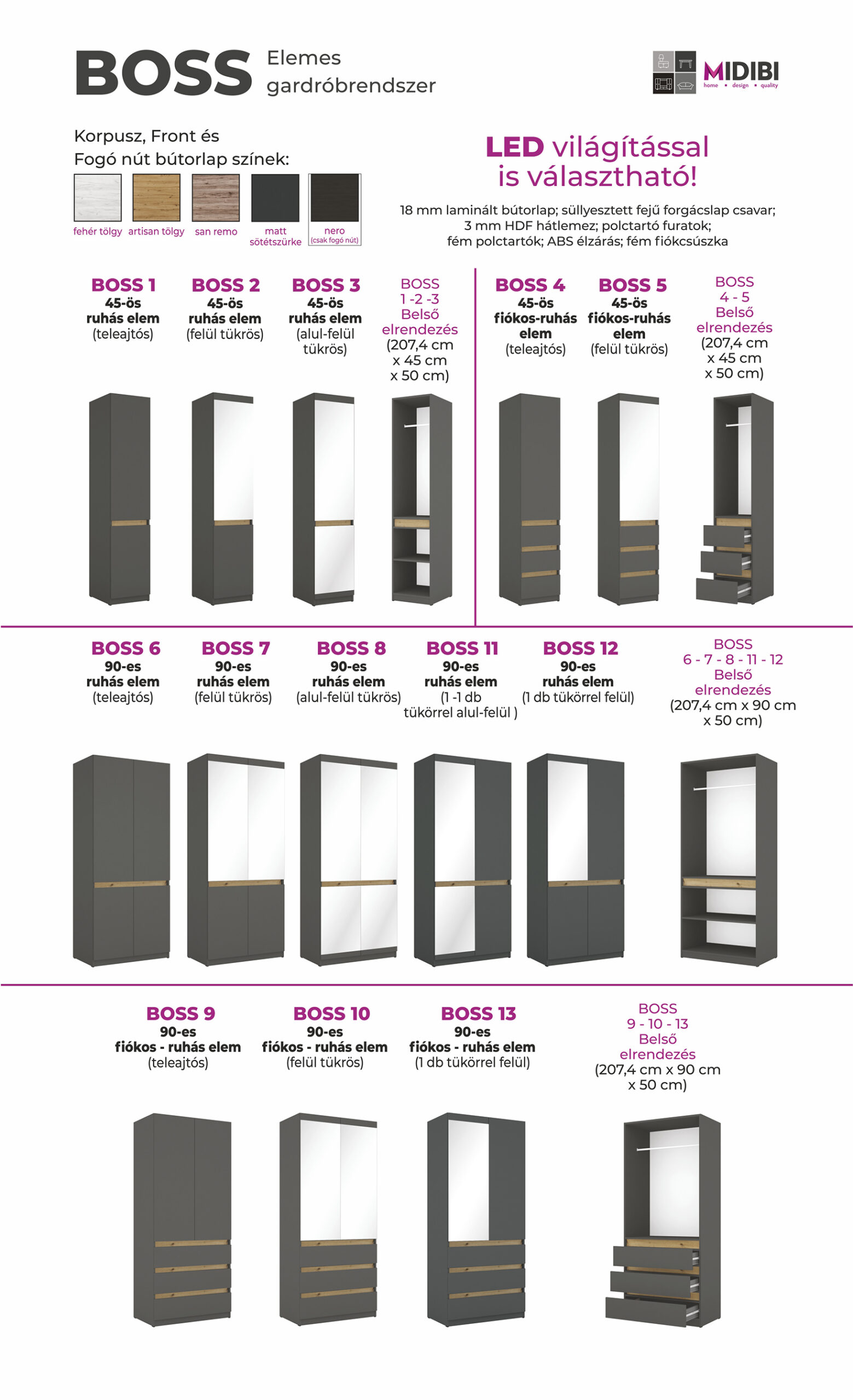 A Boss elemes gardróbrendszer előnye letisztult, modern megjelenése. 13-féle eleme tesztés szerint összeállítható így a gardróbrendszer teljesen személyre szabható. A fogó nút bútorlap színei szabadon variálhatóak az ajtó színeivel. Az alap belső kiegészíthető további polcokkal, az egyéni igényeknek megfelelően.